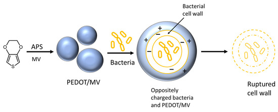 The antibacterial activity was evaluated using the minimum inhibitory concentration (MIC) according to CLSI/EUCAST as shown in Table 3. The MIC is the lowest concentration in mg mL−1 of the antibacterial agent to prevent the bacterial growth under defined conditions. For our current study, we have presented the effect of the MV dye on antibacterial properties of PEDOT:peroxodisulfate against the two bacteria, i.e., S. aureus and E. coli. PEDOT:peroxodisulfate itself exhibits MIC of 16 mg mL−1 against the both bacteria. With the introduction of the MV dye, an increase in the MIC values was observed for lower dye concentration. However, when further increasing the dye concentration, i.e., at 0.05 and 0.075 M, an improvement in the antibacterial activity of the PEDOT:peroxodisulfate was found. The MIC values obtained showed that the PEDOT:peroxodisulfate in the presence of the dye is more effective against Gram-positive bacteria compared to Gram-negative. The PEDOT:peroxodisulfate with the largest amount of dye presented the best antibacterial effect against the two bacteria. The antibacterial mechanism is generally explained by the electrostatic forces acting between the conducting polymer and the bacterial cell wall. The positively charged antibacterial agents are responsible for the disruption of cell membranes, ultimately leading to the death of the bacteria (Figure 11) [52]. Previously published reports showed the enhanced antibacterial activity of PEDOT:peroxodisulfate by preparation of composites with inorganic or organic materials. For example, Sedighi et al. showed that a composite of PEDOT with Fe2O3 nanoparticles possessed antibacterial properties against the S. aureus. [8]. Kiristi et al. reported the effect of chitosan in improving the antibacterial properties in PEDOT [21]. In addition, Kumar and coworkers demonstrated its antibacterial activity using fluorohydroxyapatite nanoparticles [53]. Herein, we have assessed the antibacterial activity of PEDOT:peroxodisulfate with the incorporation of an inexpensive dye by a facile, one step procedure, which has not been reported so far.