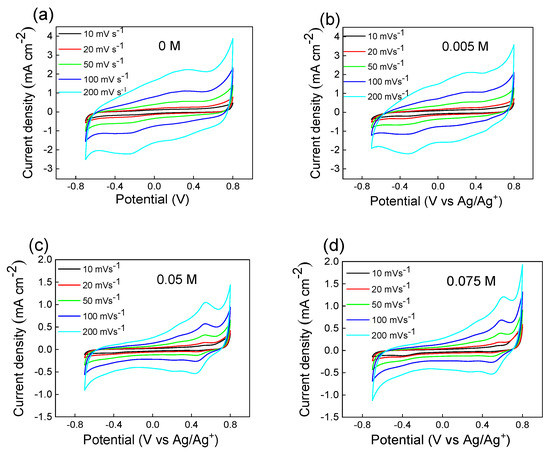 Polymer films were prepared on a glassy electrode by a drop-casting method as explained in the experimental section. Figure 11 shows the cyclic voltammograms of PEDOT:peroxodisulfate in the absence and in the presence of 0.005, 0.05 and 0.075 M of MV. The various scan rates of 10, 20, 50, 100 and 200 mV s−1 were selected over the potential window of −0.7 to 0.8 V in 0.2 M HCl. When comparing the cyclic voltammograms, it was found that PEDOT:peroxodisulfate with the lowest MV dye concentration had fairly similar electroactivity to that of the pristine PEDOT (Figure 12a,b). When the other hand, in the presence of a higher amount of the MV, the influence of nonconducting dye on PEDOT:peroxodisulfate can be seen clearly (Figure 12c,d). The experiments were performed under various sweep rates to consider their electrochemical activity. It can be inferred that the films are quite stable and display well-defined redox behavior similar to previously reported [30]. The electrochemical activity of PEDOT:peroxodisulfate in the presence of various MV concentrations, with their promising fluorescence and antibacterial activity ensure their utility in optoelectronic and medical devices [54,55].