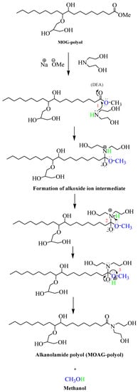 The mechanism of amidation reaction of MOG-polyol with DEA in the presence of NaOMe as the catalyst is illustrated in Figure 1. For the first step, the electron lone pair from the nitrogen atom in DEA, was the nucleophile that attacked the carbon atom in the carbonyl group of MOG-polyol. Therefore, an alkoxide intermediate was formed, followed by deprotonation of the N-H bond by methoxide ion and the formation of methanol, as in Step 2. Finally, elimination of the alkoxide ion took place, leading (Step 3) to elimination of the methanol and formation of alkanolamide polyol, namely, MOAG-polyol.
