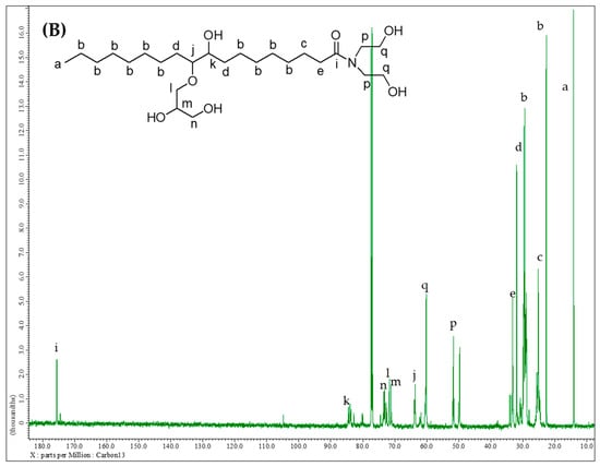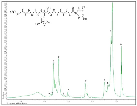 Figure 3A and Figure 3B revealed the 1H NMR and 13C NMR of MOAG-polyol, respectively. As shown in Figure 3A, new proton signals at 3.67–3.60 ppm (peak p) and 3.42–3.31 ppm (peak q) indicated that new OH groups were generated after the amidation reaction with DEA [31]. Moreover, as conformation, at signal 60.3 ppm (peak q) and 51.7 ppm (peak p) were observed in 13C NMR spectra, which indicated the presence of dibutylamide moiety in the prepared MOAG-polyol.