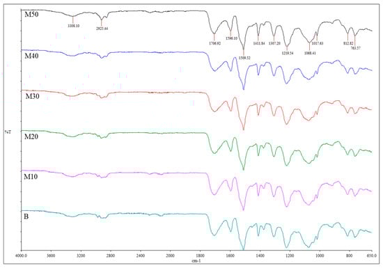 In general, the chemical structure of the manufactured foams is similar for all formulations from MOAG-polyol. The characteristic peaks indicating the formation of urethane linkages were observed. They are sharp and strong peaks of N-H stretching and bending at signals 3319–3308 cm−1 and 1510–1519 cm−1, respectively; a strong hydrogen-bonded urethane carbonyl (C=O) peak at 1708–1703 cm−1, which confirms that the urethane linkage is successfully formed [16]; another sharp and strong peak at 1224–1220 cm−1 attributed to the C-N stretching mode; and a peak at 1074–1068 cm−1 representing the C-O-C stretching mode [21,38]. All these peaks provide strong evidence for the formation of polyurethane [39]. Meanwhile, the characteristic peaks at signals 2929–2924 cm−1 and 2855–2852 cm−1 are attributed to the symmetric and asymmetric stretching vibration mode of the C-H bond in the CH3 and CH2 groups [40]. Interestingly, the peak in the range of 2269–2275 cm−1, which corresponded to the stretching vibration of N=C=O, nearly disappeared, which suggests that isocyanate groups reacted quantitatively with the hydroxyl group of polyols to form urethane bonds, as would be expected at an isocyanate index of 1.1 [7,41]. The signal at 1596–1594 cm−1 corresponds to the presence of aromatic rings in the foams while the signal at 1411 cm−1 indicates the presence of isocyanate trimerization products [40].