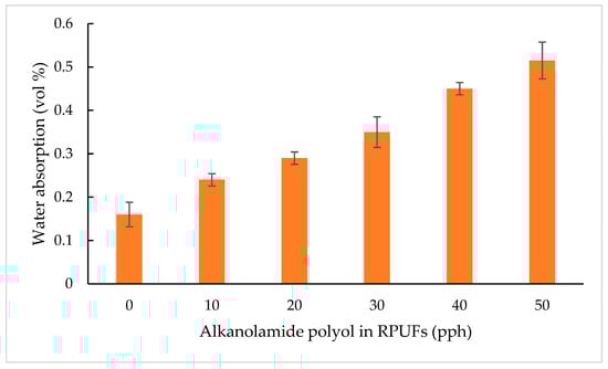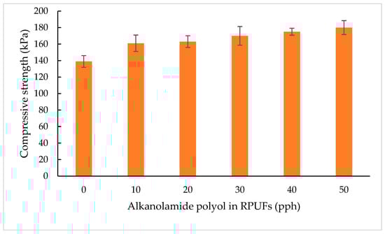 Apparent density is a crucial factor that influences the thermal and mechanical properties of the rigid polyurethane foams (RPUFs) [6]. In order to study the influence of the amount of alkanolamide polyol (MOAG-polyol) on the properties of RPUFs, all foams were prepared by the same method and the content of the other reagents kept constant. Figure 6 shows the apparent densities of alkanolamide RPUFs with various MOAG-polyol content. The apparent densities of RPUFs increased relatively by 19.53%, from 28.83 to 34.46 kg/m3, as the content of MOAG-polyol was increased from 0 to 50%. This pattern was attributed due to the increasing viscosity of the polyol blends due to the increase in bio-polyol content [25]. The increase in polyol blend viscosities limited the expansion during the foam formation and also restricted bubble formation [16,42]. Similar results were reported by Polaczek and co-workers, where the highest viscosity of polyol blends in the production of open-cell PU foams from used cooking oil gave the highest apparent density [43]. As clearly stated in the previous section, the viscosity of MOAG-polyol is 11 times higher compared with the viscosity of petroleum-based polyol. Therefore, the apparent density of RPUFs is higher in comparison with the reference RPUF due to the lower viscosity of petroleum-based polyol.