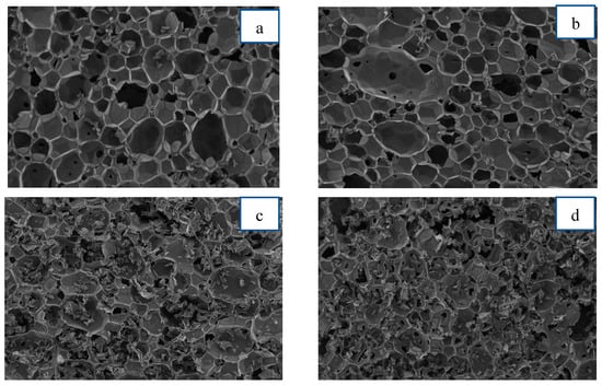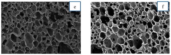 The morphology of RPUFs was analyzed using a JOEL JSM-6360 LA (Tokyo, Japan) scanning electron microscope. A thin piece of RPUF was carefully sliced with a sharp blade and stuck to aluminum stubs. Then, the samples were sputter-coated with a total of 15 nm of Au/Pd and observed under the microscope employing an accelerating voltage of 10 kV. The magnification used to observe the RPUFs was 50 nm. The statistical analysis of the six distributions of the RPUF cell was calculated on the basis of SEM images using ImageJ Software (Java 1.8.0_112, Media Cybernatics Inc., Rockville, MD, USA).