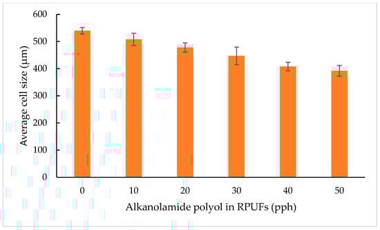 Moreover, the faster foaming and gelling time due to the addition of bio-polyol might also yield foam with smaller size due to faster polymerization [37]. It is interesting to note that with the same bio-polyol substitution, the tendency of cell size was just opposite with the apparent density; it is understandable that foam with smaller size generally has higher apparent density [4,27]. This is similar to the finding in this work.