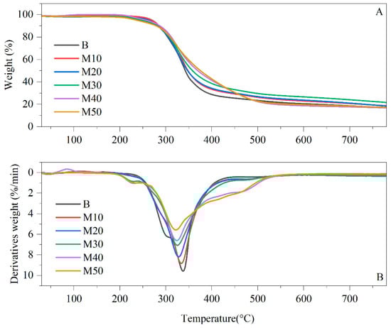 (A) TGA and (B) DTG thermograms of RPUFs from MOAG-polyol.