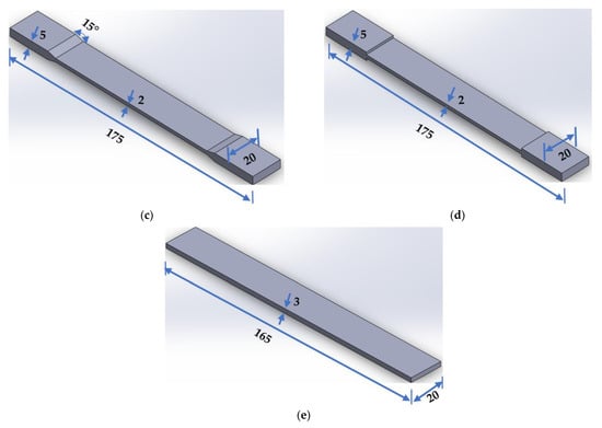 Different geometry shapes of tensile test specimen drawn by SolidWorks software, according to the respective standards: (a) ASTM D638, (b) ISO 527-2, (c) ASTM D3039-15°, (d) ASTM D3039-90°, and (e) ASTM D3039-0°.