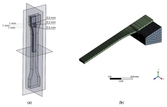 In every numerical simulation, the numerical mesh plays a key role in obtaining valid results. In order to benefit the geometrical symmetry and reduce the computational cost, every specimen’s geometrical model was clipped using its symmetry plans, resulting in only one eighth of the original geometry and half of the gripping mechanism from the experimental apparatus. Furthermore, a uniform element size was used, except for the regions with high changing rates in cross-section areas, as shown in Figure 4.