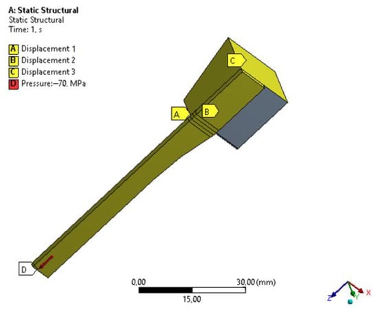 As for the boundary conditions, to emphasize the true geometrical effect and to exclude the effect of different (Force vs. Elongation) curves, a uniform stress of 70 MPa was applied to every numerical study, with a frictional contact between the specimen and the gripping jaw alongside with a zero displacement of the gripping jaw, as shown in Figure 5.