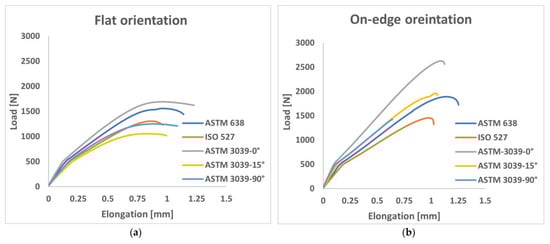 The load-displacement curves that were obtained from the tensile test for all examined shape geometry and orientations are shown in Figure 6. It is clear that the build orientation of the 3D printing parameter and the shape geometry has a significant impact on the values of force versus elongation. The results were divided into two diagrams according to the build orientations and the shapes of tensile standards examined. The highest applied loads required to reach the fracture, for the different shape geometry, were reported to the ASTM D3039-0° (for both flat and on-edge), as shown in Figure 6. The average values (out of three testing results for each orientation) of these highest loads obtained were 1693 N and 2632 N for the flat and on-edge orientations, respectively. Comparably, ASTM D638 standard specimens also showed a relatively high load, ranging between 1562 N and 1890 N for the flat and on-edge orientations, respectively. In contrast, the lowest loads were reported in specimens of the ASTM D3039-15° (at the flat build orientation) and ISO 527 (at the on-edge build orientation), with values of 1026 N and 1475 N, consecutively.