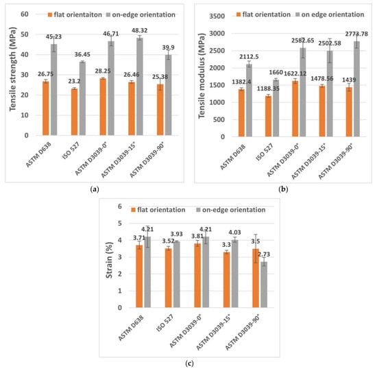 Figure 7a–c presents the results of the ultimate tensile strength, tensile modulus, and tensile strain of the tested specimens. In terms of the tensile strength, it can be seen from Figure 7a that, at flat build orientation samples, the values ranged between 23.2 MPa and 28.25 MPa, where the best strength was from ASTM D3039-0°. However, the on-edge build orientation showed higher tensile strength, ranged between 36.45 and 48.32 MPa, and the better values were from ASTM D3039-15°. In both flat and on-edge orientations, the lowest tensile strengths were from the ISO 527 specimens. The increased tensile strength of these specimens is due to their reliable geometry shape, which avoided the weak spot at the neck (curvature) of the specimens of ASTM D638 and ISO 527. Therefore, the applied load was distributed across a larger area, resulting in higher resistance to failure. Regarding the effect of print orientation, generally, the on-edge specimens revealed much higher tensile strength as compared to the flat-printed ones. For instance, the average of the ASTM D3039-0° tensile strength for the on-edge orientation was 39.52% higher than that of the flat orientation. Furthermore, the increased tensile strength of ASTM D3039-0° for the flat and on-edge orientations was higher than the ISO 527 geometry shape (the weakest) by 17.87% and 21%, respectively. In a comparison between ISO 527 and ASTM D638, the tensile strength average of ASTM D638 specimens was higher than the average of ISO 527 specimens by 13.27% and 19.5% for the flat and on-edge orientations, respectively.