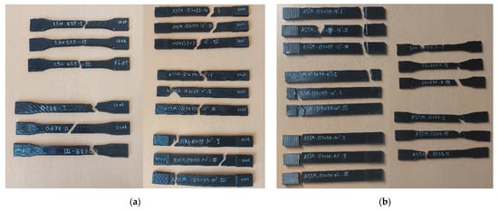 Figure 8 shows the broken specimens after the tensile test. As is well-known, it is much better for the breakage/failure to be in the middle of the gauge section than in other parts of specimen. As is obvious from Figure 8, the broken area for the on-edge orientation was always near the edge of the specimen, with the breaks near the gripping area, which is not recommended. In general, the on-edge orientation of FDM samples tends to yield higher strength, as indicated by the findings from various investigated standards. However, the impact of orientation is particularly notable when considering the ASTM D638 and ISO 527 standards. These observations align with the results reported by Aliheidari et al. [53], supporting the notion that the mechanical properties are directly influenced by the distinctive characteristics of the layered structure, specifically the adhesion between the layers. In contrast, the fracture in most of the flat printed specimens was almost in the middle.