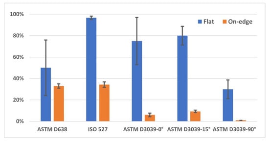 In terms of the tensile modulus, the flat build orientation values were ranged between 1188 MPa and 1622 MPa, where the best values were from ASTM 3039-0°. On the other hand, the tensile modulus of the on-edge build orientation ranged between 1660 MPa and 2773 MPa, and the better values were from ASTM D3039-90° (see Figure 7b). In addition, the tensile modulus of ASTM D3039-0° was 26.74% and 40.15% higher than the ISO 527 geometry shape (the lowest modulus) for the flat and on-edge orientations, respectively. In a comparison between ASTM D638 and ISO 527, the average of the ASTM D638 specimens was 14% and 21% higher than the ISO 527 geometry shape for the flat and on-edge orientations, consecutively. Concerning the tensile strain (see Figure 7c), which was determined at the yield strength, its values were ranged between 2.73% and 4.21% (for both orientations). The ASTM D3039-0° and ASTM D638 specimens exhibited the highest values, while the ISO 527 specimen showed the lowest value. The tensile strain average value of the ASTM 3039-0° at on-edge orientation was 9.5% higher than the flat orientation of the same shape.