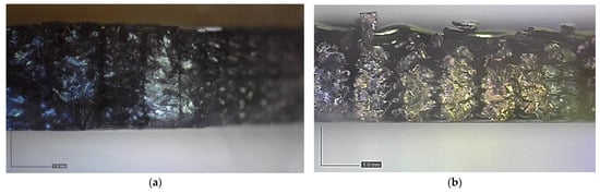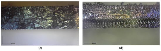When examining fracture surfaces of tensile specimens using an optical microscope, the flat and on-edge orientations offer distinct insights into the material’s fracture behavior. The flat orientation allows for a detailed analysis of surface features, crack patterns, and material characteristics, providing valuable information about the material’s response to external forces (see Figure 10a,b). In contrast, the on-edge orientation exposes layered structures, internal defects, and interfacial characteristics, offering a deeper understanding of the material’s internal properties and structural integrity (see Figure 10c,d). By combining these observations, a comprehensive understanding of fracture mechanisms, contributing factors, and the material’s overall response to stress can be achieved. The fracture surfaces observed in both the flat and on-edge orientations exhibit characteristics typically associated with brittle fractures, as demonstrated in Figure 10, which showcase optical microscope images of the fractured specimens. The flat specimen fractured at an angle of 45°, aligning with the structure of its raster direction. On the other hand, the on-edge specimens displayed a fracture angle of 90°. Notably, despite the difference in fracture angles, the on-edge test piece exhibited higher tensile strength, attributed to the robust design of the inner lines and the presence of doubled shell layers. These structural features contribute to improved mechanical properties and enhanced structural integrity, leading to the observed increase in tensile strength.