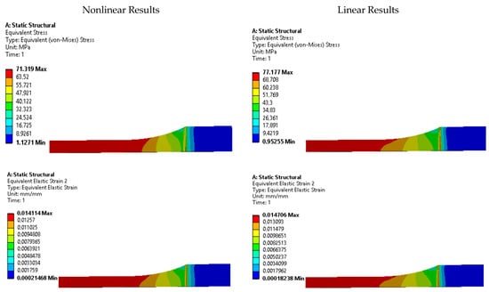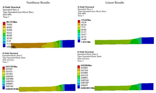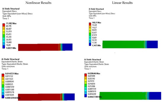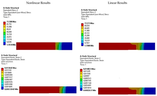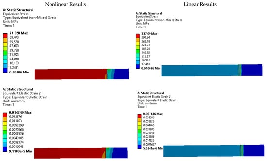 The results presented in Table 6 provide valuable insights into the behavior of the tested specimens. It is evident that the linear stress-strain model tends to overestimate the equivalent stress, while the nonlinear model yields values that are closer to the stress values used in the simulation settings. This discrepancy highlights the importance of using an accurate representation of the material’s stress-strain curve for reliable simulations.