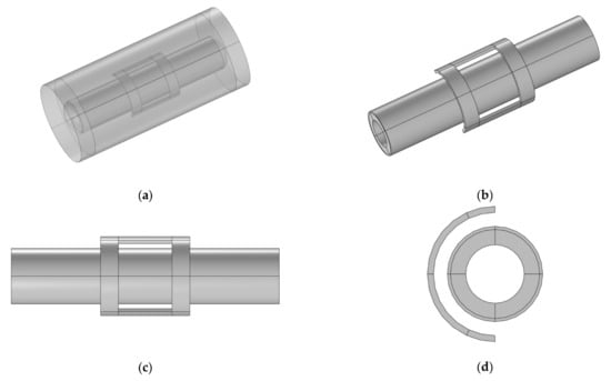 Geometric model of induction heating; (a) overall geometric model, (b) geometric model with air domain removed, (c) The front view of the geometric model with the air domain removed, (d) The side view of the geometric model with the air domain removed.