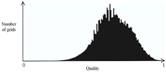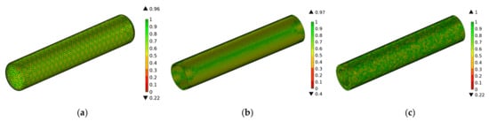 To ensure the continuity of the magnetic field during the rotation process, it is necessary to form consistent boundary pairs at the interface between the rotating and stationary domains. This allows the magnetic field generated by the coil to act on the rotating domain. Figure 2 illustrates a schematic diagram of the consistent boundary pairs, where the yellow and pink mixed boundaries represent the consistent boundary pairs. The consistent boundary pairs are composed of surface elements, and the mesh is divided using a free triangular mesh for the boundary region while a free tetrahedral mesh is used for the remaining parts. The quality of the mesh directly affects the accuracy and efficiency of the calculations, and a good mesh quality ensures the accuracy of the results. The closer the numerical value of the mesh quality is to 1, the better the mesh quality. Figure 3 shows the mesh quality, where (a) represents the mesh quality of the consistent boundary pairs, (b) represents the mesh quality of the CFRP circular tube, and (c) represents the mesh quality of the mold. It can be observed from the figure that there are relatively few meshes with a quality below 0.5. Figure 4 shows a histogram of the geometric mesh quality, which intuitively indicates that the mesh quality is mainly concentrated between 0.5 and 0.8, indicating a good mesh quality for the mesh division.