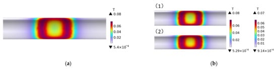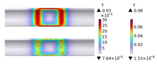 Figure 5a,b illustrates the magnetic flux density distribution of plain-weave CFRP circular tubes wound without molds and with FRP molds, respectively, during the induction heating process. In the figures, (1) represents the CFRP circular tube example, corresponding to the color bar on the left, and (2) represents the mold example, corresponding to the color bar on the right. The arrangement of the CFRP circular tube and the mold in the figures is the same. As can be seen from the figures, the magnetic flux distribution of the CFRP circular tube on both the mold and without the mold appears rectangular, consistent with the projection of the coil on the tube, and the numerical values are also very similar. Figure 5b shows that the expression of the CFRP circular tube with the FRP mold is almost the same numerically, which is due to the fact that the magnetic conductivity of the CFRP circular tube is the same as that of the FRP mold.