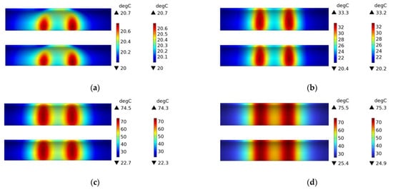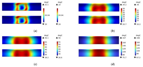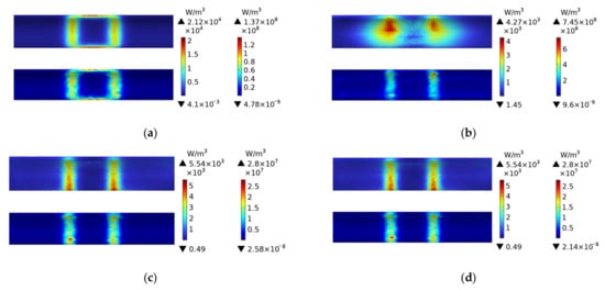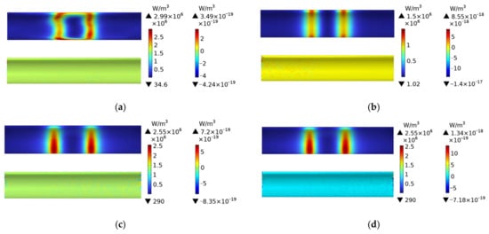 Figure 8 shows the distribution of eddy current losses of plain weave CFRP cylindrical tubes wound with FRP molds during the process of rotating induction heating, from initial heating to steady-state. From the figure, it can be observed that the FRP mold does not generate heat. When compared to Figure 7, it can be noticed that the distribution and numerical values of eddy current losses of the CFRP cylindrical tube in Figure 8 are almost identical to those in Figure 7. This is because only closed loops of current can generate heat, and FRP is non-conductive. Therefore, during the heating of the CFRP cylindrical tube with an FRP mold, the heat source originates entirely from the CFRP itself.