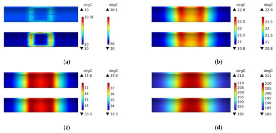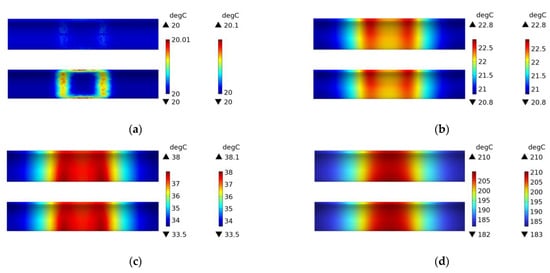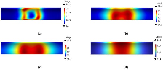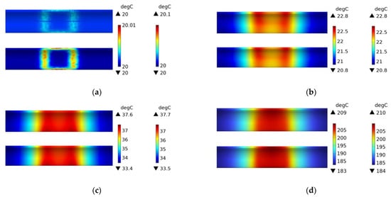 Figure 19 shows the temperature field distribution of the CFRP circular tube (winding angle of 45 degrees) with a 45# steel mold and winding structure during the induction heating process from initial heating to steady state. Compared with Figure 12 and Figure 16, it can be observed that the temperature field distribution in these three figures is almost identical, which once again demonstrates that the metal mold is the primary source of heat generation during electromagnetic induction heating.