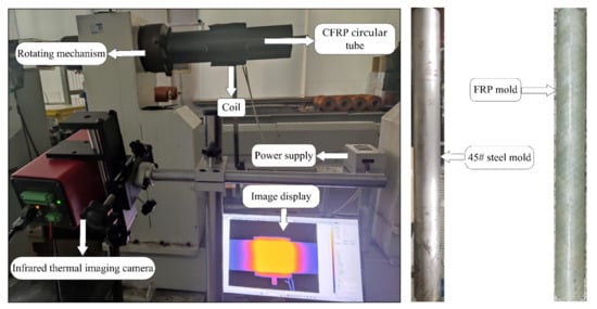To validate the accuracy of the finite element model established in this study, experimental tests were conducted to investigate the temperature distribution during electromagnetic induction heating of the CFRP circular tube. The experimental setup for induction heating of the CFRP circular tube is shown in Figure 13. The rotational mechanism provides power to rotate the CFRP circular tube against the mold, and the FOTRIC 618C infrared camera is used to record the heating process. The coil is powered by a control power supply. The dimensions and parameters of the coil structure in the experiment are consistent with those set in the simulation.