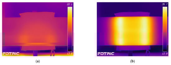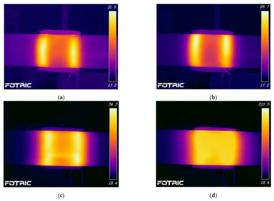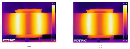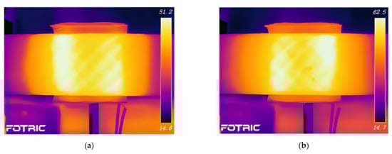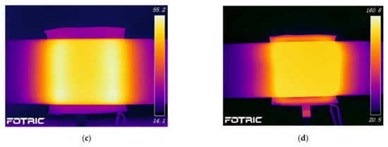 Figure 21 shows the experimental results of the induction heating of a CFRP tube wrapped around an FRP mold with a winding angle of 45 degrees. Comparing it with the simulation in Figure 20, it can be observed that the distribution and values of the temperature field are consistent between the two, which confirms the accuracy of the simulation.