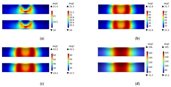 Figure 20 shows the temperature field distribution of the CFRP circular tube (winding angle of 45 degrees) with an FRP mold and winding structure during the induction heating process from initial heating to steady state. At 1 s, it can be clearly seen from the figure that the temperature is mainly distributed in the area opposite to the centerline of the coil, and it presents an “X” cross shape, with the highest temperature at the intersection point, which is consistent with the characteristics of the 45-degree winding angle. From 60 s onwards, the temperature field gradually shifts from the center to both sides, and with increasing time, the temperature values in the corresponding areas on both sides continue to rise, and the temperature field distribution range also expands along the axis of the circular tube, until steady state is reached. At a steady state, the temperature at the center is the highest and relatively uniform, and the temperature field spreads towards both sides. Compared with Figure 11 and Figure 17, it can be found that when the CFRP circular tube is used as the heat source, the plain weave structure with more fiber interweaving points and the winding structure with a winding angle of 45 degrees have very similar temperature fields at the final steady state, and the temperature field distribution at the center is relatively uniform. However, the steady-state temperature field of the winding structure with a winding angle of 89 degrees is not very uniform, which indicates that the structure of CFRP has a significant influence on the temperature field distribution. Compared with Figure 11, Figure 12, Figure 16, Figure 17 and Figure 19, regardless of the material of the mold and the structure of the CFRP circular tube, when heated under a specific arc-shaped coil, the temperature field distribution is basically related to the two vertical edges of the coil, and before reaching steady state, the temperature values of the two vertical edges are relatively high. It can be found that the coil shape has a crucial influence on the temperature field distribution, which has certain predictive significance for the temperature field distribution of heated CFRP components.