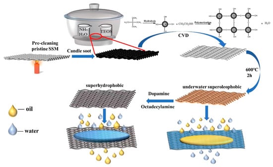 In this paper, a high strength, economical, and easily available SSM (SSM) is used as the substrate and a certain thickness of soot is adsorbed on the surface of the SSM through the candle combustion process, and silica is then uniformly deposited on the SSM surface by vacuum-assisted CVD of tetraethoxysilane (TEOS). The sol-gel method was catalyzed by ammonia solution [28,29], and the formed hybrid carbon/silica network was further calcinated, which led to the removal of carbon and intimate attachment of the silica network on the surface of SSMs. The resultant superhydrophilic/underwater superoleophobic SSMs were further modified to the superhydrophobic SSMs by the solution immersion of octadecylamine. Both SSWs with different surface wettability were successfully used for oil/water separation, and their separation performance and efficiency were investigated in detail.