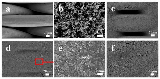 SEM was used to characterize the surface morphology of pristine SSM, SiO2/SSM-1. As shown in Figure 2a, the pristine SSM surface was smooth without obvious attached substances. Figure 2b showed the soot layer, and the metal mesh induced the incomplete combustion of the candle and produced a large number of soot particles, which uniformly covered the surface of the SSM. The SSM surfaces after CVD for 16 h, 24 h, and 36 h and after calcination are illustrated in Figure 2c,d,f, respectively. A small amount of nanoparticles were deposited on the SSM surface with a deposition time of 16 h, and the mesh aperture was still relatively obvious at this time. After 24 h deposition, the mesh size was obviously reduced, and the thickness of the silica nanoparticles covered on the surface was increasing. As the deposition time increased to 36 h, the presence of the mesh pores was almost invisible, and the thick deposition of SiO2 particles may have led to looser attachment on the SSM surface. Therefore, a deposition time of 24 h was chosen for the next application.