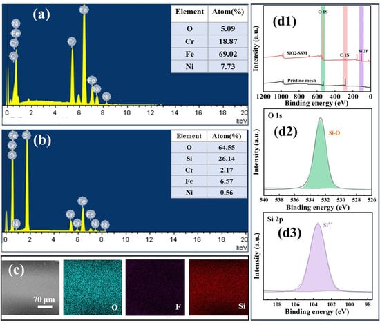 (a) EDS spectra of original SSM; (b) EDS spectra of SiO2 loaded SSM; (c) Element Mapping spectra of SiO2 loaded stainless steel mesh; (d1) XPS spectra of original SSM and SiO2 loaded SSM, (d2) O 1s peak fitting image, and (d3) Si 2P peak fitting image.