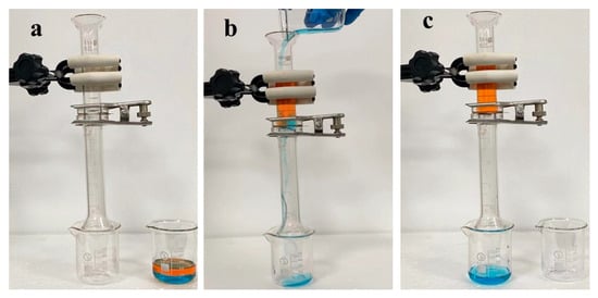An immiscible solution of oil and water phases was poured onto the pre-wetted SiO2/SSM-1, which is fixed and sandwiched between two glass tubes. The oil/water separation process is shown in Figure 5. For the oil phase, n-hexane, n-octane, iso-octane, petroleum ether, and carbon tetrachloride was dyed red with Sudan III, respectively, and it was dyed blue with methylene blue for the water phase. The two phases were mixed according to Voil/Vwater = 1/1, and were then poured into the glass tube from the top. When all of the deionized water entered the collection bottle below, timing was stopped and the spent time started being recorded. The whole separation process was carried out only under the action of gravity. Water penetrated quickly, and the oil was blocked above the SiO2/SSM-1. The separation mechanism can probably be attributed to the fact that the superhydrophilic surface of SiO2/SSM preferentially attracted the water phase in the three-phase system of oil/water/solid, and that the highly rough surface resulted in a quite small area fraction of the solid. Water molecules were tightly trapped in the rough SiO2/SSM-1 micro/nanostructures, which allowed the water phase to pass through the mesh by its gravity quickly, and the formed water barrier layer repelled the oil penetration. The separation efficiency was calculated by the following formula: