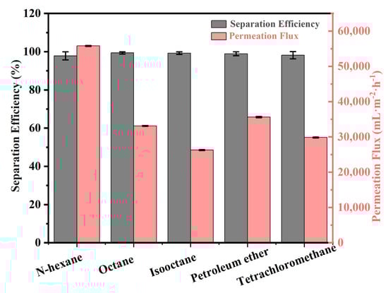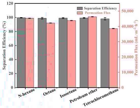 It can be seen that different mixtures of oil and water are separated efficiently with high separation fluxes using the SiO2/SSM [33]. Figure 6 shows the separation efficiencies and permeate fluxes of the different light oil and water mixtures. The separation flux was calculated by the following equation: