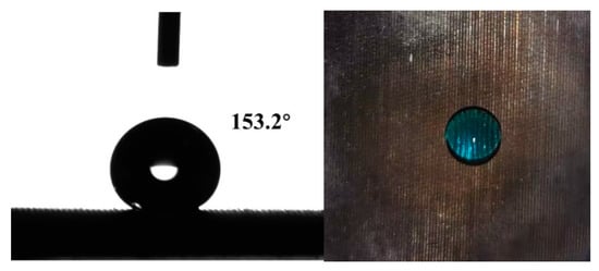 After hydrophobic modification with a low-surface energy material of octadecylamine, the prepared SSMs with hierarchical structures possessed superhydrophobicity, which benefited the oil/water separation. As shown in the Figure 7, the water droplet (blue-dyed by methylthionine chloride) was seated spherically on the superhydrophobic surface of SSM-2, with a WCA of 153.2°.