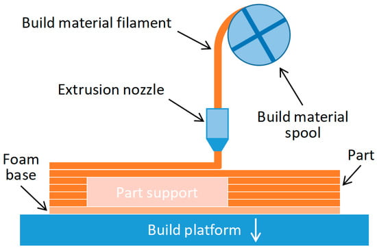 In FFF, a thermoplastic filament is melted and used to construct the cross-sectional geometry of an object on a build platform. Various materials can be utilized in FFF, including polycarbonate (PC), polylactic acid (PLA), acrylonitrile butadiene styrene (ABS), polyamide (nylon), and more [4,5,6,7]. The printing process involves heating the thermoplastic polymer filament to its viscous point, and then extruding it through a nozzle, in a layer-by-layer fashion, onto a glass plate. The layers adhere to one another through the molecular interaction between the extruded molten filament and the solidified layer. This thermoplastic behavior allows for the fusion of layers, and facilitates the transition from a molten state to a solid state, as the temperature decreases.