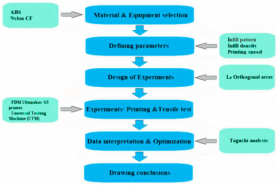 As mentioned earlier, FFF technology utilizes thermoplastic materials with high strength, such as ABS and nylon. Nylon, known for its excellent impact strength, stress resistance, high tensile and flexural strength, thermal stability, and cost-effectiveness, is currently used in automotive parts [21] and medical components [22]. However, ABS is highly resistant to heat and chemicals, and is suitable for machining. Its affordability also contributes to its popularity as a material choice. ABS is applied in the automotive, household-goods, electronics, and medical-application industries, among others. In addition, FFF parts can be reinforced to enhance their mechanical and physical properties [23,24,25]. One commonly used reinforcing fiber is carbon fiber, which exhibits progressive deformation behavior, and is widely employed in strengthening polymers.