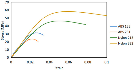 Figure 5. Stress–strain curves of ABS 133, ABS 231, nylon 213, and nylon 332 3D-printed parts.