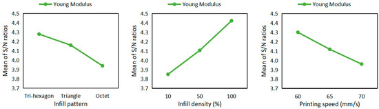 Therefore, as indicated in the literature mentioned earlier [12,13,14,15,16,17,18,19,20], the infill density, infill pattern, and printing speed play a crucial role in determining the tensile strength of 3D-printed parts. By meticulously selecting and effectively controlling these key process parameters, researchers and manufacturers can optimize the mechanical properties and overall performance of parts produced using the fused filament fabrication (FFF) technique.