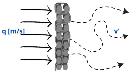 The actual air velocity varies throughout the porous space (Figure 1), due to the connectivity and geometric complexity of that space. This variable velocity can be characterized by its mean value. The average air velocity depends on how much of the cross-sectional area A is made up of pores and how the pore space is connected within the complex woven structure. The resultant spatial air velocity of air through the textile material will be reduced to the average of all local velocities v′.