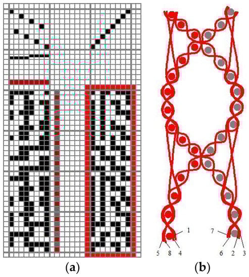 Structure of the layer interchanging double cloth [37]: (a) fabric weave and (b) fabric cross-section.