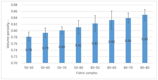 Volume porosity denotes the percentage of the sum of the pores’ volume in the total volume of the fabric (Equation (1)). Volume porosity takes place when the woven fabrics are viewed as a three-dimensional formation. Void spaces (pores) can be found in fibers, between the fibers in the yarn, and between the warp and weft threads in the fabric. As textile materials, woven fabrics have, compared to knitted fabrics or non-woven textiles, the most precisely determined internal geometric model of the porous structure in the form of a tubular system, where each macro-pore has a cylindrical shape with a permanent cross-section of their entire length [8].