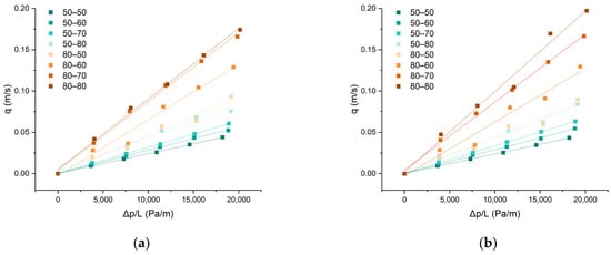 In Figure 5, a plot of flow velocity (Q/A = q) against the pressure drop per unit length (∆p/L) on the woven fabric samples is presented. The air flux (q) values are linearly related to a slope equal to k/µ. The slope is determined for each approximate direction that corresponds to K air conductivity, i.e., air permeability.