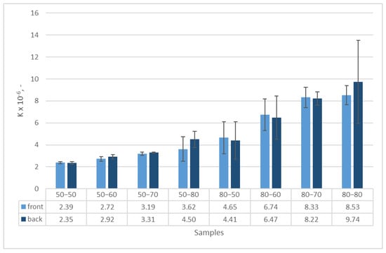 From the graphical representation in Figure 5, it is evident that there is a correlation between the fineness of the weft yarns and the air permeability of the fabric. Fabrics with lower average weft yarn fineness values exhibit a higher slope K, indicating greater air permeability on both the face and back of the fabric. The differences in permeability between the front and back of the same fabric samples were not significant (shown in the bar graph in Figure 6), indicating that the composition and position of the layer in relation to the direction of the airflow do not significantly affect permeability. From all of the graphical representations, it is clear that the air permeability property undergoes significant changes in the fabric samples, with a single layer composed of high-fineness yarns. Increasing the fineness in the second layer leads to larger jumps in differences in air permeability.