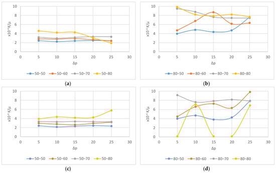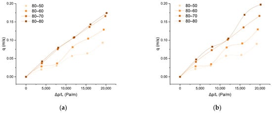 Samples exhibiting nonlinear air permeability behavior have been identified. From the graphs in Figure 8, it is evident that there is no linear relationship between flow rate and pressure drop. At certain pressures, the change in airflow velocity through the material is very small. This is due to differences in the structural characteristics of the two layers of the composite, which influence the size and stability of the vertical pores. These samples are the ones designated as 50-80, 80-50, and 80-60. In the case of the 80-80 sample, which is made from the finest yarns in the warp and weft (both layers), significant nonlinearity is observed upon direct contact with the airflow on the acrylic side. The cause of such nonlinear air permeability behavior could be attributed to the deformation of vertical pores in both layers. Under pressure, the sample undergoes compression, and the yarns have enough space for inter-structural displacements, resulting in changes in pore size and shape under pressure.