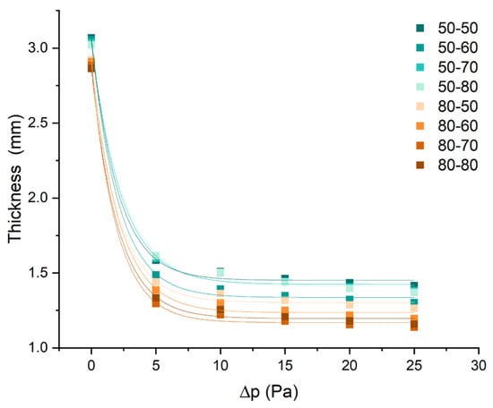 With the application of Darcy’s law, i.e., finding a Darcy’s constant implies a constant fabric architecture, however, woven fabrics have a certain compressive flexibility that depends on the yarn density and the weave and porosity. With increasing air pressures on the woven fabric surface, there is an evident non-linear decrease in thickness (Figure 9). This may lead to K, a dynamic value based on Darcy’s law, especially at the beginning of testing.