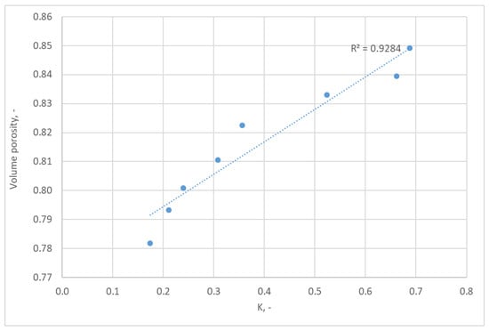 The ε/K graph (Figure 11) exhibits a deviation from linearity. Although the coefficient of determination is 0.93, the observed deviations could be due to the presence of ineffective porosity. Ineffective porosity refers to regions within the fabric structure that do not contribute significantly to the airflow. These regions may include areas with blocked or restricted airflow due to the woven fabric’s complex structure or the presence of certain fibers. These factors can lead to deviations from the expected linear relationship between porosity and air permeability.