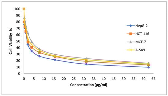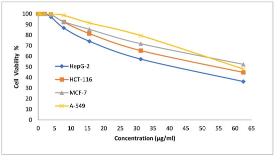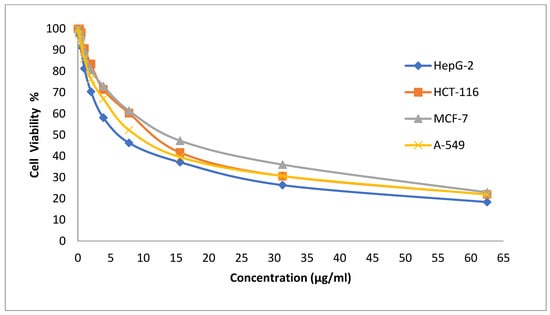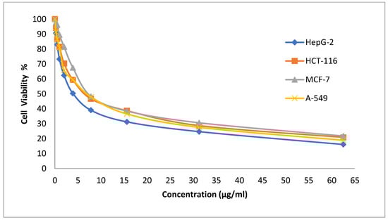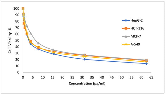 Human breast cancer cell line MCF-7; human hepatocellular carcinoma cell line HepG-2; colon cancer cell line HCT-116; and lung cancer cell line A-549 are examples of mammalian cell lines. the VACSERA Tissue Culture Unit provided. Chemicals: Trypan blue dye, dimethyl sulfoxide (DMSO), and crystal violet were all acquired from Sigma in St. Louis, MO, in the United States. Lonza was used to acquire foetal bovine serum, DMEM, RPMI-1640, HEPES buffer solution, L-glutamine, gentamycin, and 0.25% Trypsin-EDTA. When assessing cytotoxicity activities, the established methodology was used.