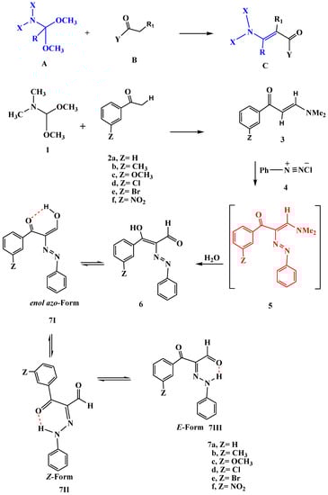 When diazotized phenyl diazonium chloride 4 was coupled with enaminones derivatives 3a–f, a product of coupling and dimethylamine hydrolysis was also eliminated. 1H NMR of this product show that it exists in DMSO as an equilibrium mixture of enol azo- form 7I, Z-form 7II and the E-form 7III, as 1H NMR revealed that the major constituent in this equilibrium mixture was for the E-form, also these forms are stabilized by hydrogen bonding. This is completely consistent with what Al-Zaydi et al. [] have published or what we have published before that compound 7III (phenyl diazonium chloride was p-ClC6H4) exists in the E-form and we have published an X-ray crystalographic analysis of it [].