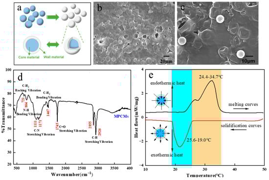 (a) Structure diagram of phase change microcapsule, (b,c) SEM of phase change microcapsules under different magnification of electron microscope, (d) Fourier transform infrared spectroscopy of phase change microcapsules, (e) DSC curve of phase change microcapsules.