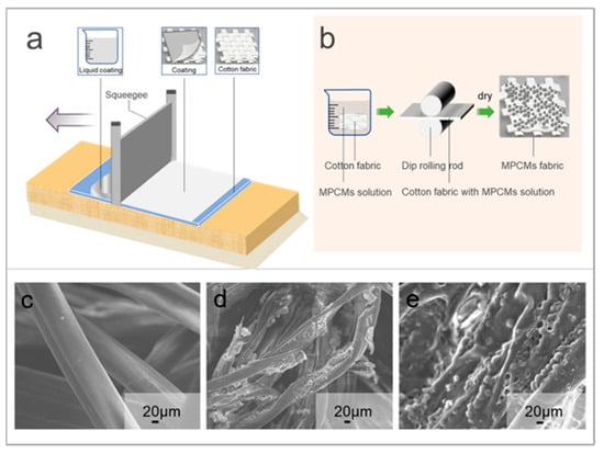 (a) Preparation of phase change microcapsule temperature control fabric by coating method, (b) Preparation of phase change microcapsule temperature control fabric by dip rolling, (c) SEM image of untreated cotton fabric, (d) SEM image of samples prepared by dip rolling method, (e) SEM image of samples prepared by coating method.