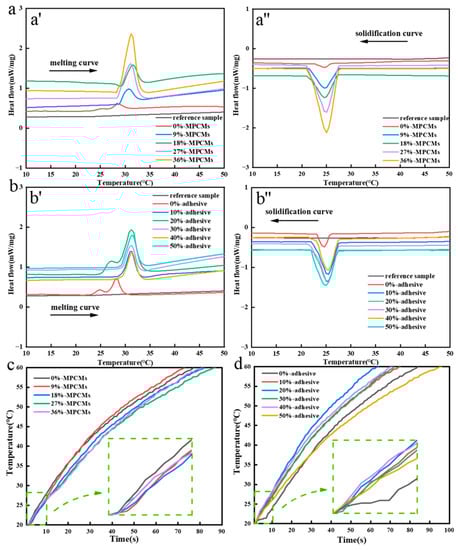 Dip rolling method (a) DSC curve of samples with different content of phase change microcapsules, (b) DSC curve of samples with different binder content, (c) Temperature rise curve of samples with different content of phase change microcapsules, (d) Temperature rise curve of samples with different binder content.