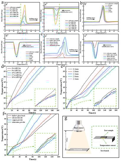 Coating method (a) DSC curve of samples with different content of phase change microcapsules, (b) DSC curves of samples with different coating thickness, (c) DSC curves of samples with different thermal conductivity, (d) Temperature rise curve of samples with different content of phase change microcapsules, (e) Temperature rise curve of samples with different coating thickness, (f) Temperature rise curve of samples with different thermal conductivity, (g) Schematic diagram of heating rate test.